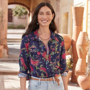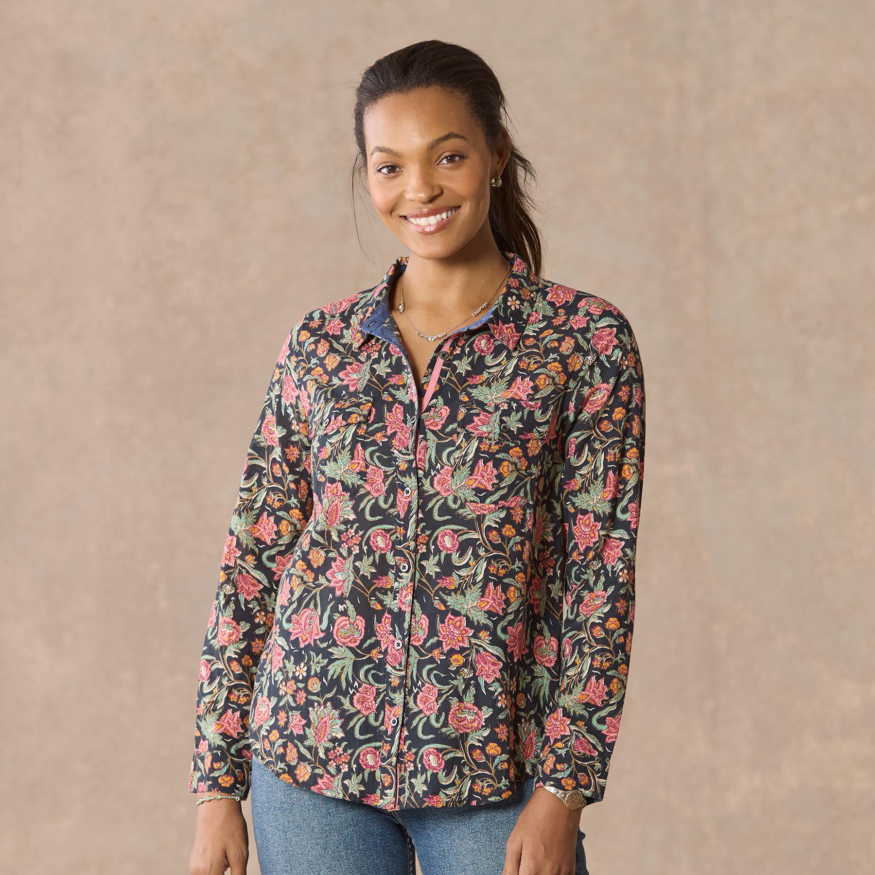 Cheerful floral print on our soft top with patch pockets. back yoke and button cuffs. Cotton. Machine wash. Imported. Exclusive. Sizes XXS (00). XS (0-2). S (4-6). M (8-10). L (12-14). XL (16-18). Approx. 24.5l.