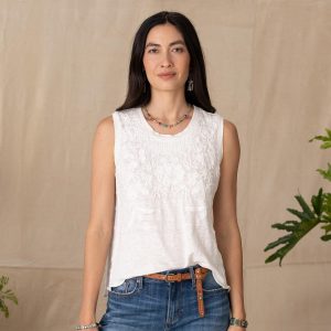 A true statement piece. our breezy linen tank embellished with tonal embroidery. French knot and raw-edge details. scalloped hem and embroidered side panels. Hand wash. Imported. Exclusive. Sizes XS (0 to 2). S (4 to 6). M (8 to 10). L (12 to 14). XL (16 to 18). XXL (20 to 22). Approx. 24L.