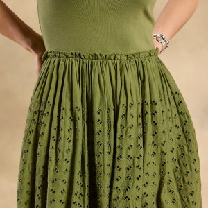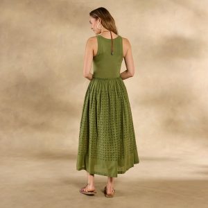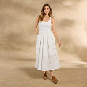 Soon to be your go-to casual ‘fit. our easy popover tank dress is detailed with mixed rib. woven eyelet and raw edge ruffles at the waistline. Side seam pockets. lined skirt. Cotton. Machine wash. Imported. Exclusive. Sizes XS (0–2). S (4–6). M (8–10). L (12–14). XL (16–18). XXL (20–22). Approx. 53l.