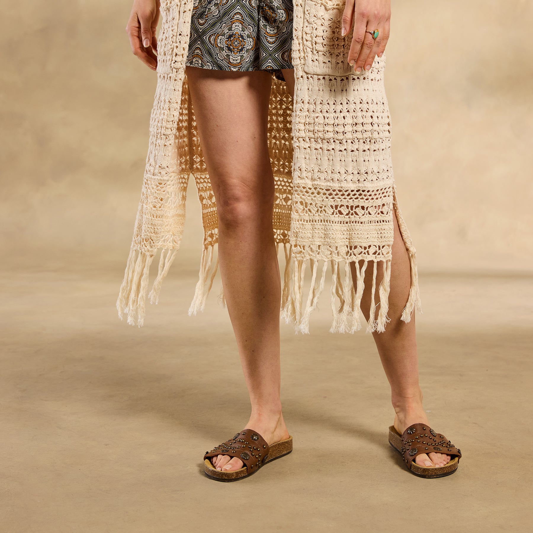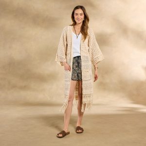 The ultimate neutral statement layer. our Island Sands Duster is absolutely brimming with special details—from mixed-stitch construction and hand-crocheted details to flirty fringe. Open front; patch pockets. Cotton. Hand wash. Imported. Exclusive. Sizes XS/S (0–6). M/L (8–14). XL/XXL (16–22). Approx. 42l.