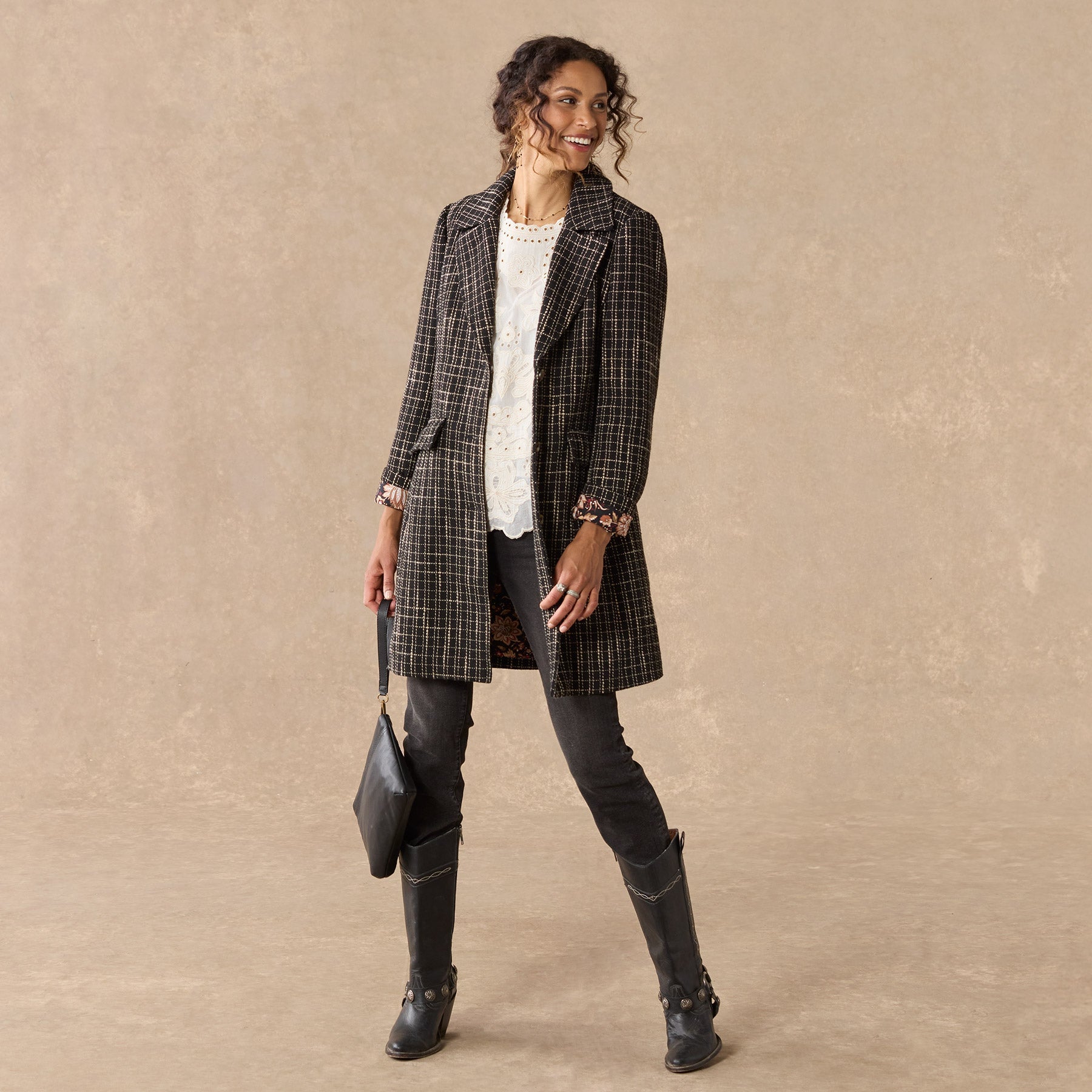 Our ladylike coat is slightly fitted. in a slubby plaid. with three-button closure. flap pockets and a standout floral lining. Soft and comfortable. midi-length. with a nice A-line shape. Wool/polyester. Dry clean. Imported. Exclusive. Sizes XXS (00). XS (0?C2). S (4?C6). M (8?C10). L (12?C14). XL (16?C18). Approx. 35l.