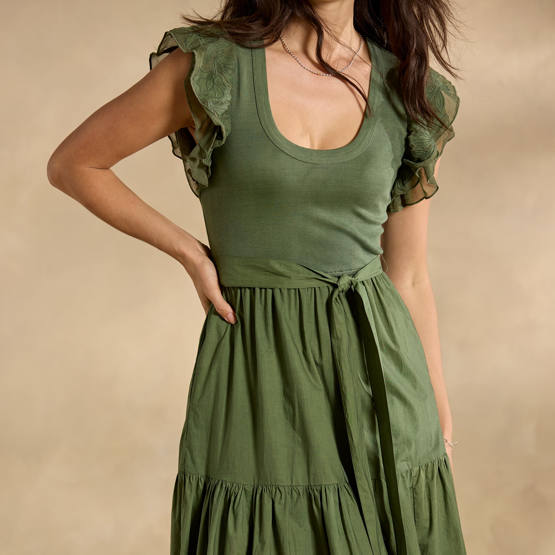 The intricate tonal detail that defines our mixed-media Madera Dress demands a closer look! With a rib-knit bodice. poplin skirt and delicate chiffon cutout details throughout??plus ruffled sleeves. scoop neck. elastic waist and lined skirt. Cotton. Machine wash. Imported. Exclusive. Sizes XS (0-2). S (4-6). M (8-10). L (12-14). XL (16-18). XXL (20-22). Approx. 49l.