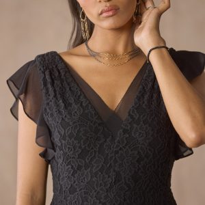 This beautiful. mesh lace dress has chiffon ruffle accents throughout and features ruffle feather sleeves. a v-neck front and back with eyelash trim and back zipper. Fully lined. CONTENT. CARE. Imported. Sizes XS (0-2). S (4-6). M (8-10). L (12-14). XL (16-18). XXL (20-22). Approx. XXl