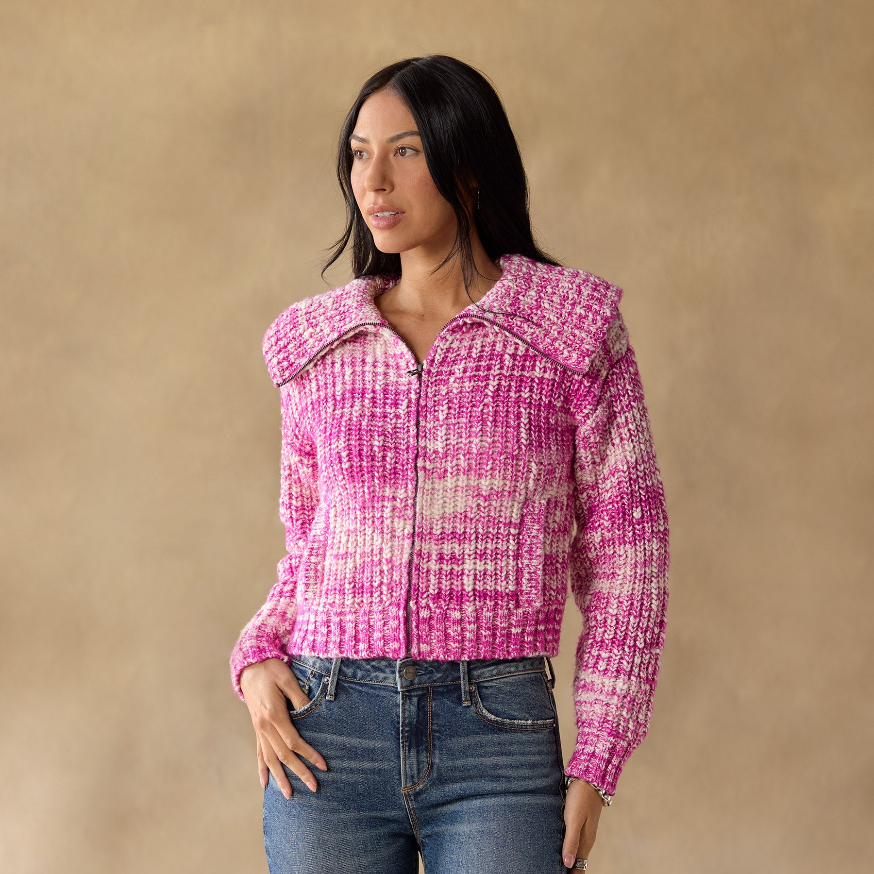 Our chunky. space-dyed slub cardigan keeps you warm and chic. with rib body. zip front. leather zipper pull. a generous. zip-through collar and feminine volume sleeves. Lots of texture and style. with transfer and pointelle details. welt pockets and rib trim. Acrylic/merino wool/pafafil. Hand wash. Imported. Exclusive. Sizes XS (0–2). S (4–6). M (8–10). L (12–14). XL (16–18). XXL (20–22). Approx. 19l.