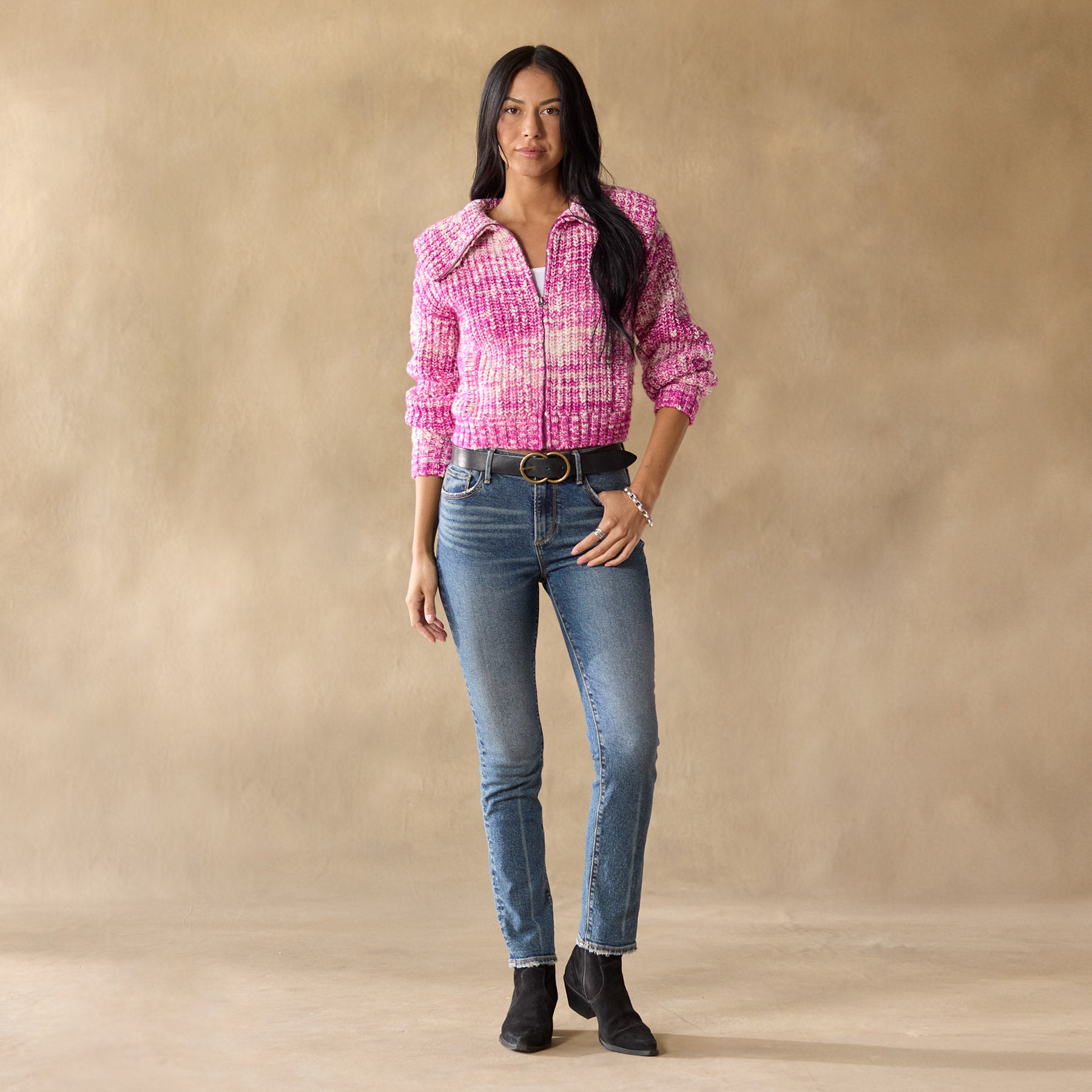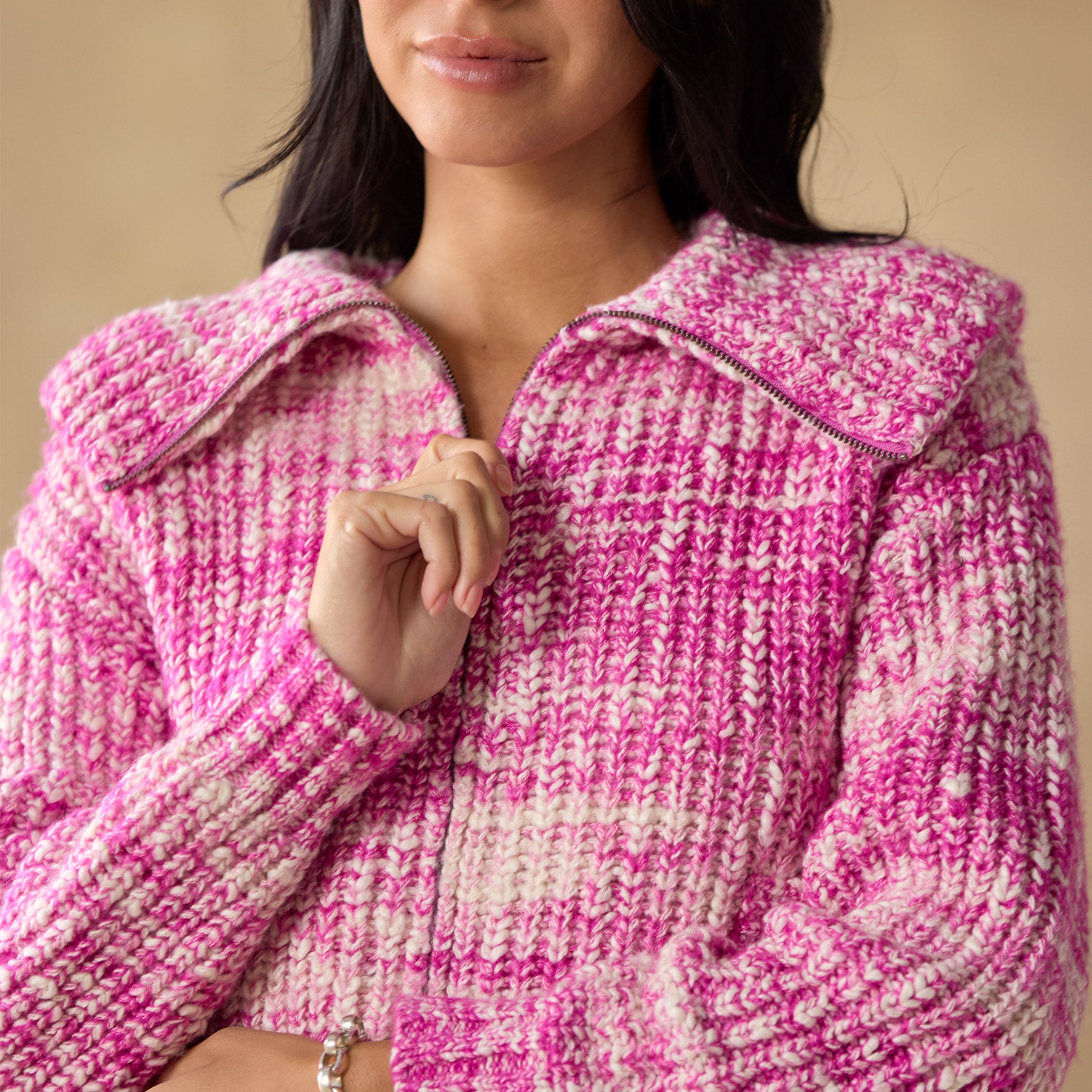 Our chunky. space-dyed slub cardigan keeps you warm and chic. with rib body. zip front. leather zipper pull. a generous. zip-through collar and feminine volume sleeves. Lots of texture and style. with transfer and pointelle details. welt pockets and rib trim. Acrylic/merino wool/pafafil. Hand wash. Imported. Exclusive. Sizes XXS (00). XS (0–2). S (4–6). M (8–10). L (12–14). XL (16–18). Approx. 17l.